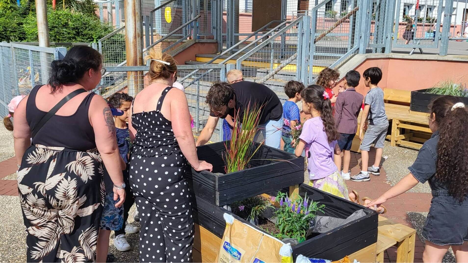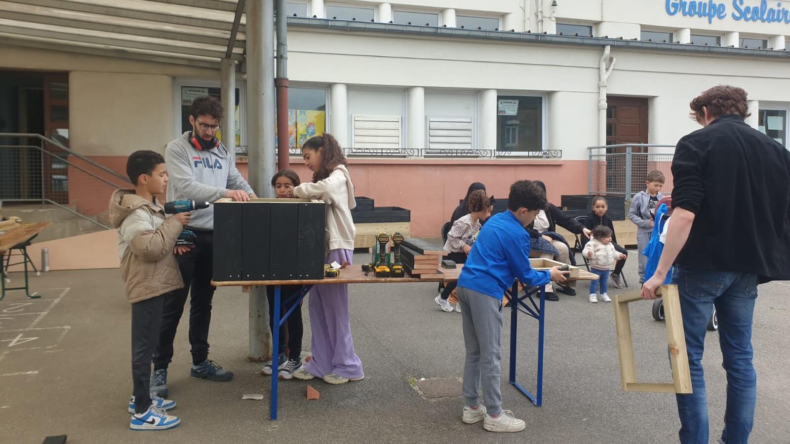 Sur la première partie de l’année 2024, SEED a organisé plusieurs ateliers de concertation et de co-design en compagnie d’élèves de l’école afin de définir avec les enfants leurs souhaits pour l’aménagement d’un parvis plus sécurisé et agréable. Des rencontres ont ensuite eu lieu avec les parents. S’en sont suivi plusieurs journées de chantiers participatifs en compagnie des habitants du quartier ainsi qu’avec le service jeunesse du Louvroil (jeunes de 13 à 18 ans) afin d’aménager sur le parvis plusieurs espaces de détente / rencontre et des bacs de plantations.