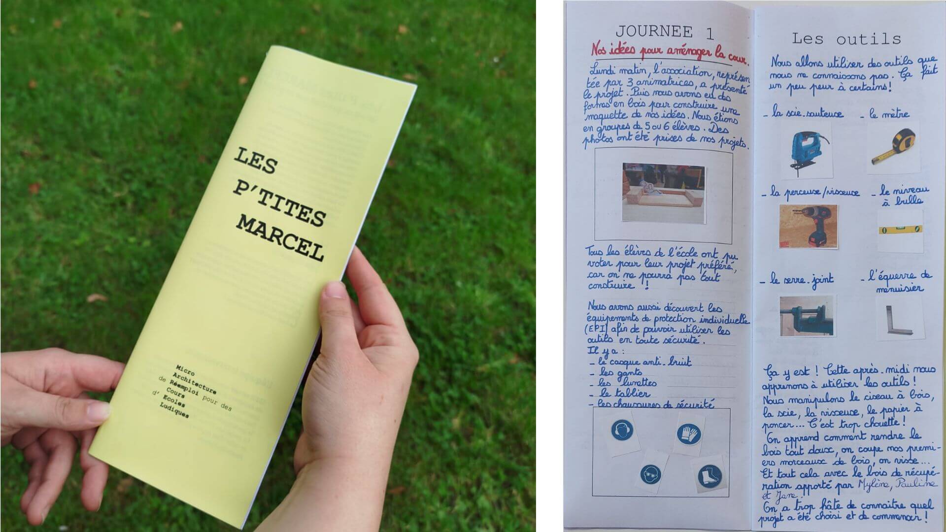 Les P’tites MARCEL (Micro Architectures de Réemploi pour des Cours d’Écoles Ludiques) aborde les questions d’architectures et de réemploi auprès des classes primaires. Les élèves discutent des usages de leurs cour de récréation, réfléchissent aux impacts écologiques des matériaux et deviennent acteurs de la transformation de leur cour d’école à travers un projet d’aménagement concret.