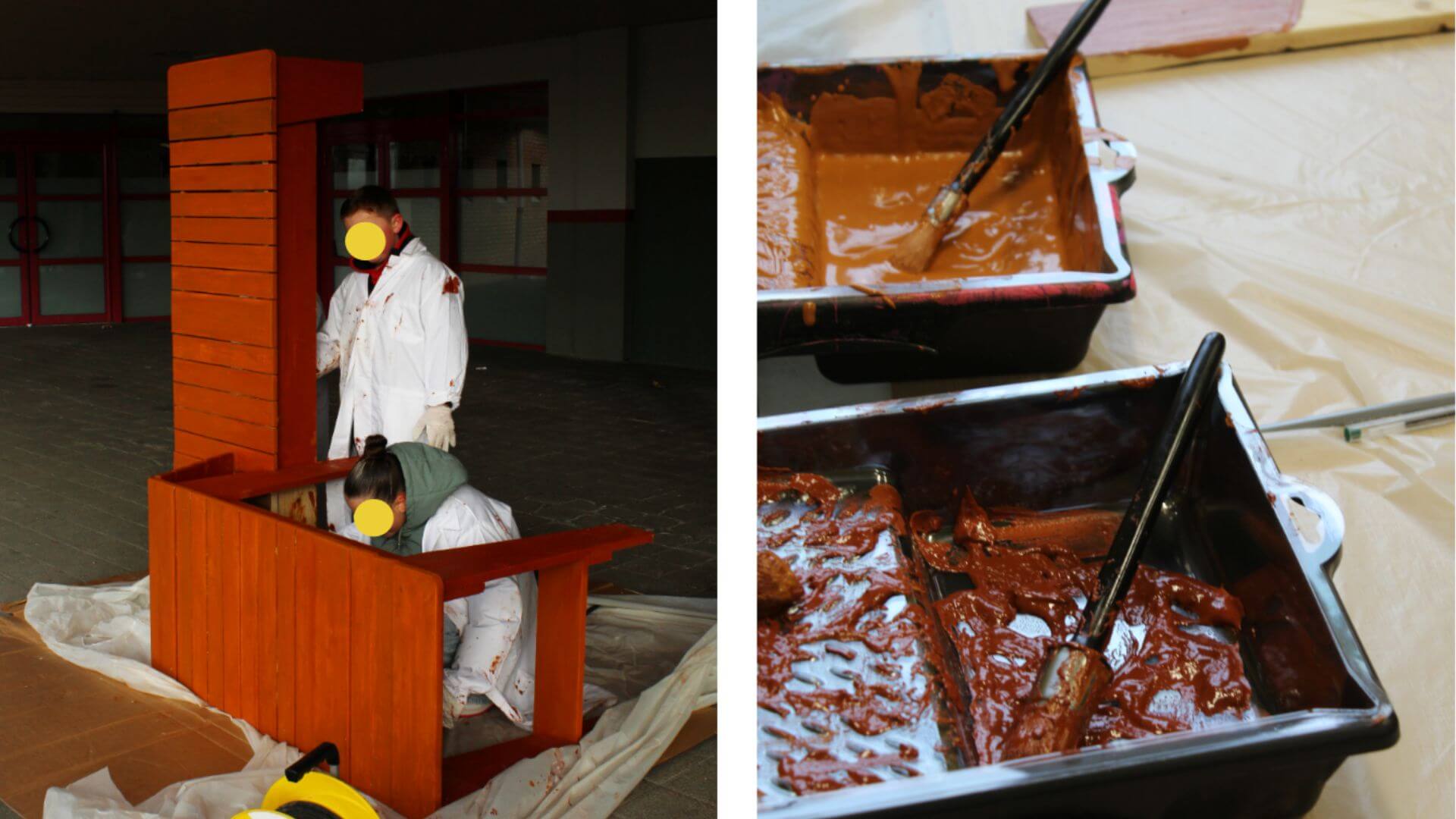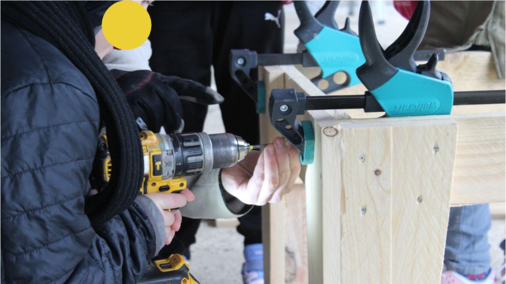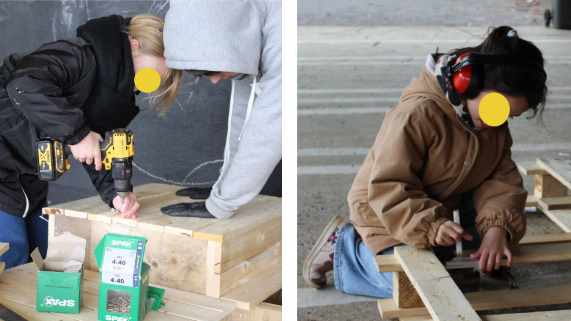 Au long de la semaine les élèves sont amenés à concevoir collectivement à l’aide de maquettes les mobiliers de leur cour d’école, préparer la peinture naturelles qui les protégera, manipuler les outils pour mesurer/tracer et les machines portatives pour percer, couper, assembler les constructions.